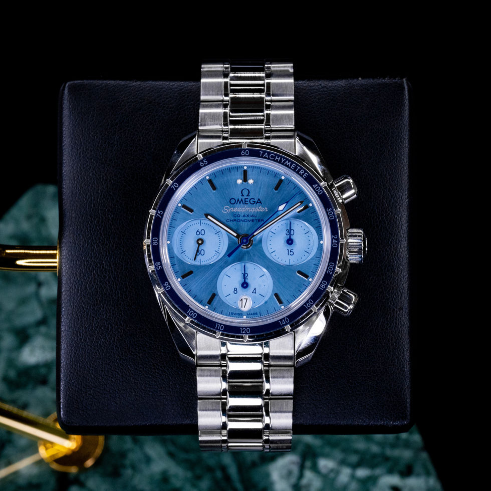 This gorgeous Ice Blue sun-brushed dial easily stands out on the wrist. The Ice Blue Speedmaster has been crafted with simplicity and a pop of color in mind, while still retaining the look and heritage of OMEGA’s most famous chronograph.